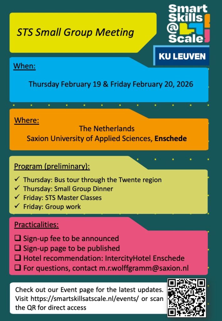 Voor de STS-fanaten die niet zo lang kunnen wachten, vanuit het SmartSkills@Scale programma en de KU Leuven wordt een extra, tweedaags evenement georganiseerd op donderdag 19 en vrijdag 20 februari 2026 in Enschede. De tweedaagse bestaat uit een tour langs regionale kernpartners en een reeks STS masterclasses georganiseerd voor promovendi, postdocs, (praktijk)onderzoekers en praktijkprofessionals. Voor meer info, zie de flyer hieronder. Houd de socials en SmartSkills@Scale nieuwsbrief in de gaten voor de updates en inschrijflink! En laten we kijken wat Nederland ons kan leren over sociotechnisch ontwerp.
